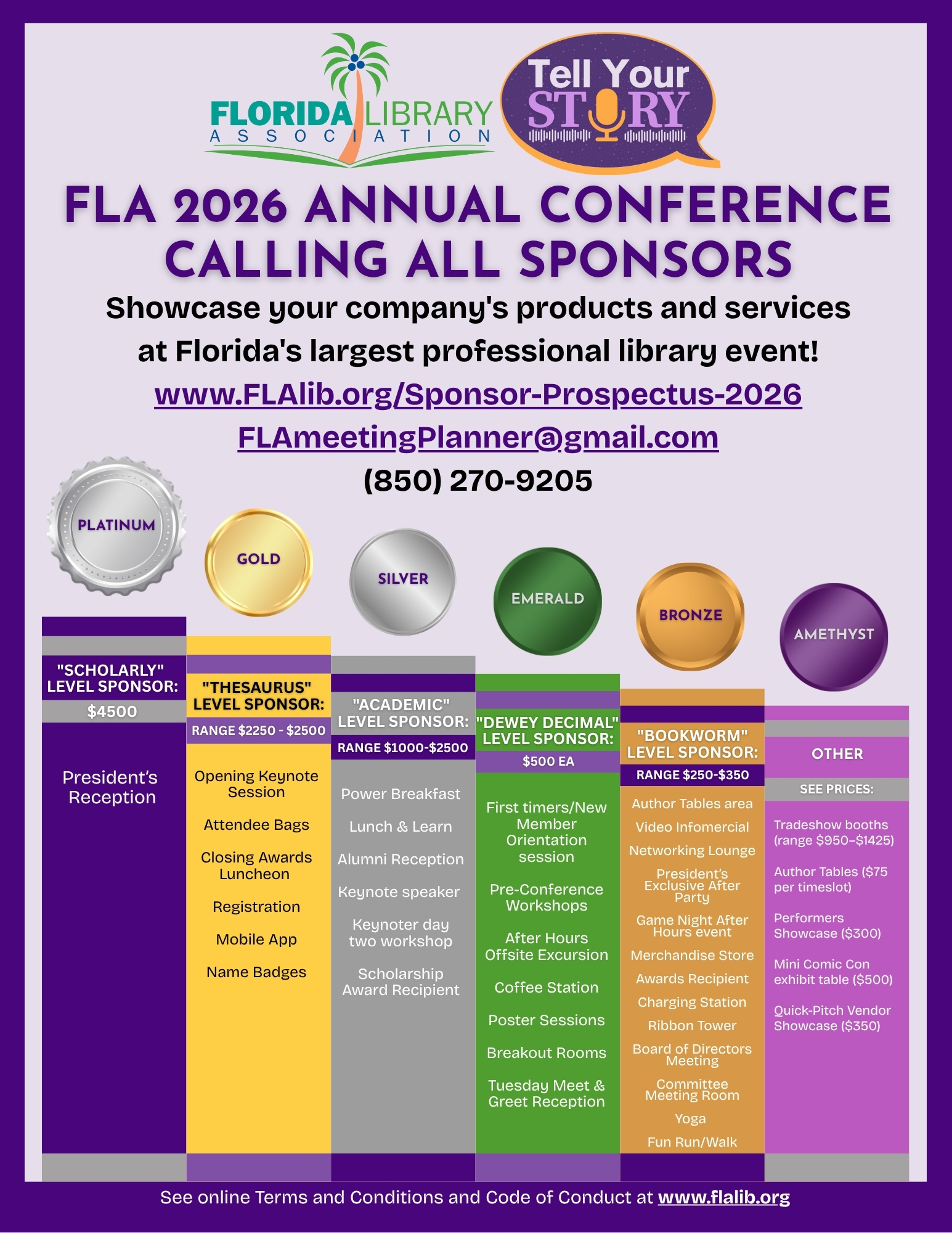 | Bronze "Bookworm" Level Sponsor: FLA Board of Directors Meeting - $350 | Benefits: